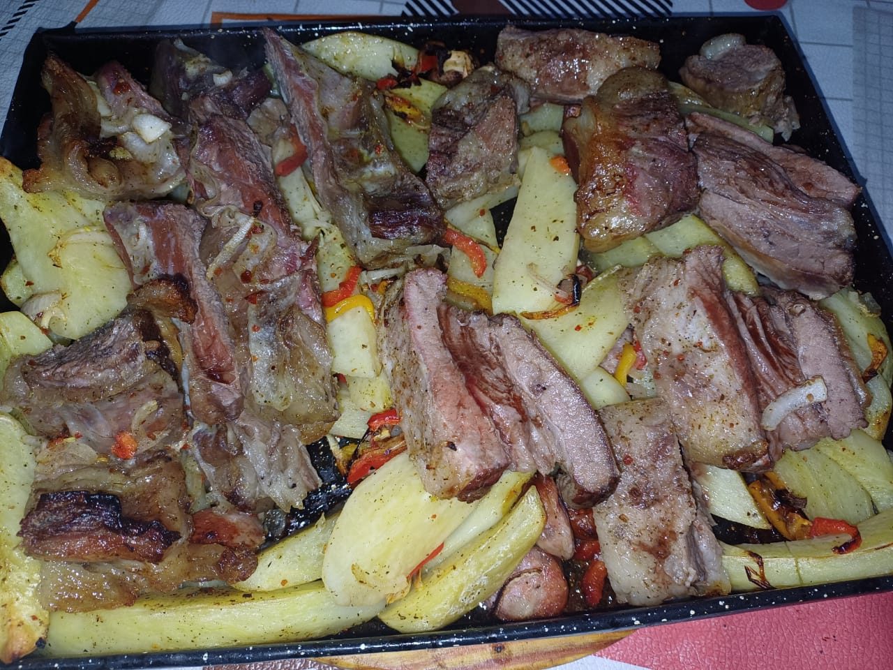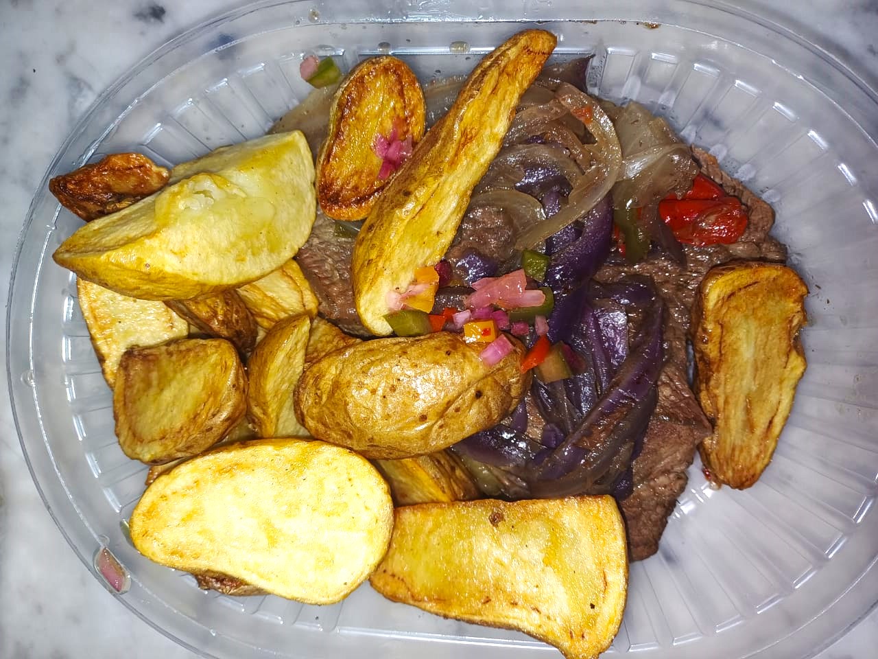 Carne de ternera tierna y jugosa, acompañada de papas rústicas doradas y verduras al horno, perfectamente sazonadas. Un plato completo que combina sabores intensos y caseros con una presentación apetitosa, ideal para quienes buscan un almuerzo reconfortante y nutritivo.