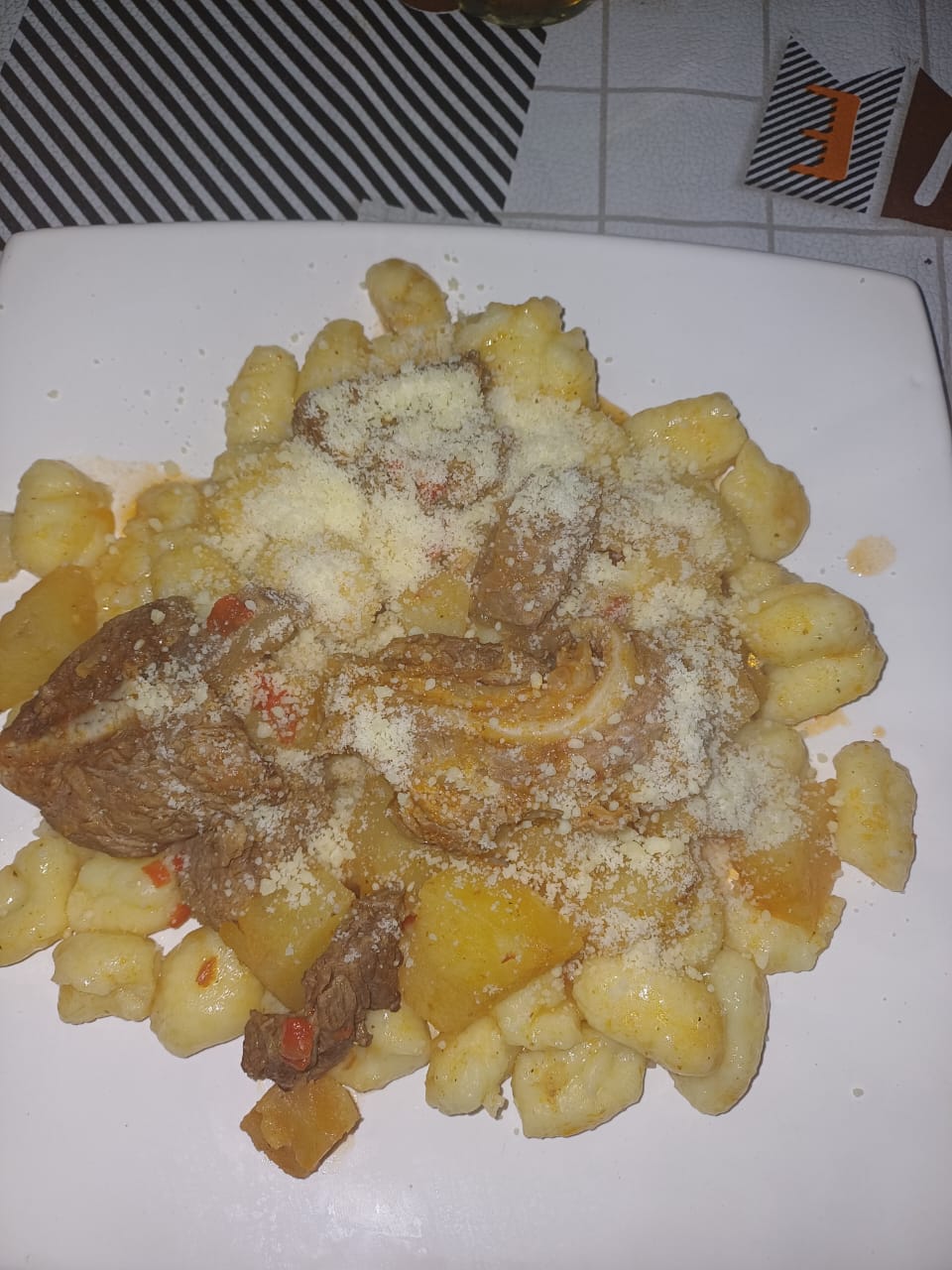 Ñoquis caseros, suaves y esponjosos, acompañados de un estofado de ternera tierno y jugoso, cocinado lentamente con verduras y especias que realzan su sabor. Un plato tradicional, reconfortante y lleno de aromas caseros.