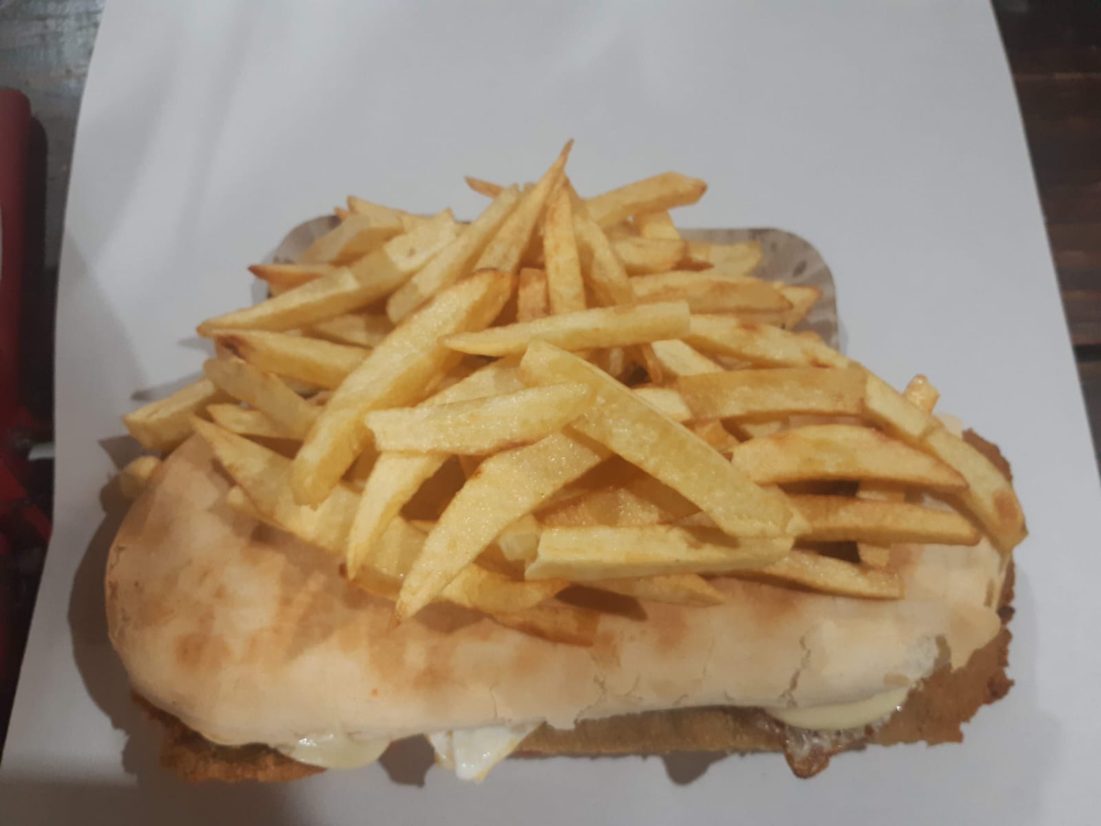 Sándwich con milanesa de carne tierna y crocante, acompañado de lechuga fresca, tomate, huevo frito, jamón y queso, con aderezo a elección. Servido con papas fritas doradas y crocantes, un plato abundante y sabroso que combina textura, frescura y sabor casero.
