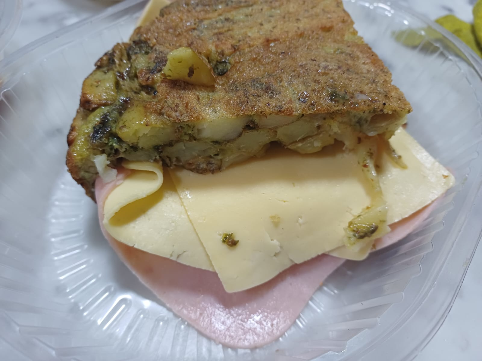 Tortilla casera de papas y huevos, rellena con jamón y queso, dorada por fuera y suave y cremosa por dentro. Un plato clásico, abundante y sabroso, ideal para quienes buscan un bocado reconfortante y completo.
